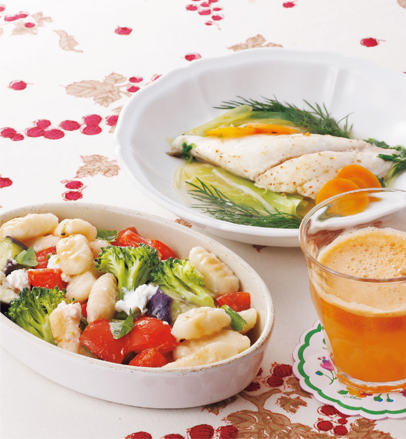 カロリー控えめで、でんぷん、ミネラル、ビタミン、たんぱく質がしっかり摂れる献立です。ニョッキは完熟トマトをソース代わりにしたグラタンに、白身魚は野菜といっしょに蒸して風味豊かに。濃い味つけは肌の老化を加速させます。ハーブやスパイスを使って素材のうまみを引き出せば、濃い味つけは必要なくなります。