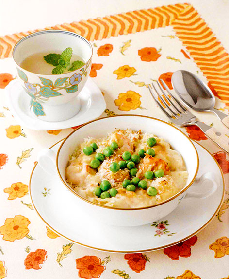グラタンのお皿と受け皿は、母メイ・ウシヤマからのもので、小さい時よりこのお皿でグラタンやピラフをいただいていました。