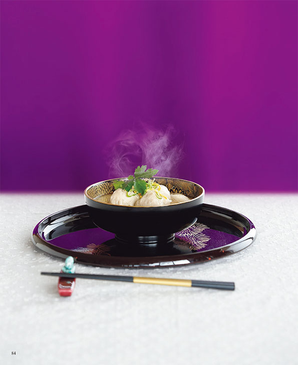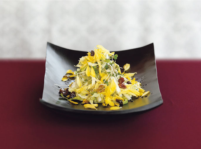 そばがきを白みそ仕立てにし、身体が芯からぽかぽかと温まる一椀にしました。そばは古来より”長寿食”として知られ、血行を促進する作用があります。白菜サラダは、身体をアルカリ性に保つ作用があります。血液をきれいにする菊の花びらを散らし、香り高くあでやかで、体によい一品に。透明感のある素肌を生み出す取り合わせです。