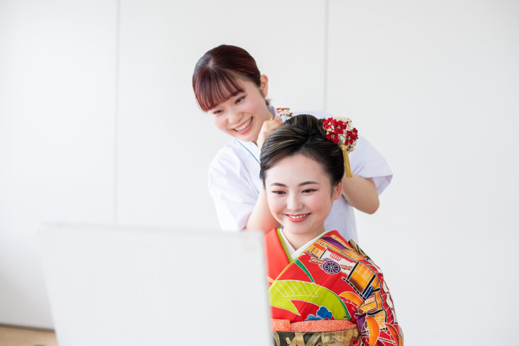 和装を基礎から学びます。相モデルで行う事で接客マナーも身に付きます。スペシャリスト科目では、振袖、飾り結び、袴の着付けなども学ぶことができます。