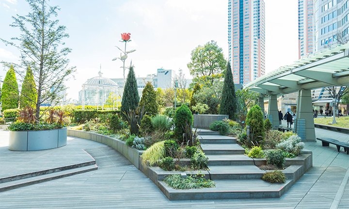 ローズガーデンは憩いの場として学生たちに親しまれています。5月には色とりどりのバラが咲き乱れます。