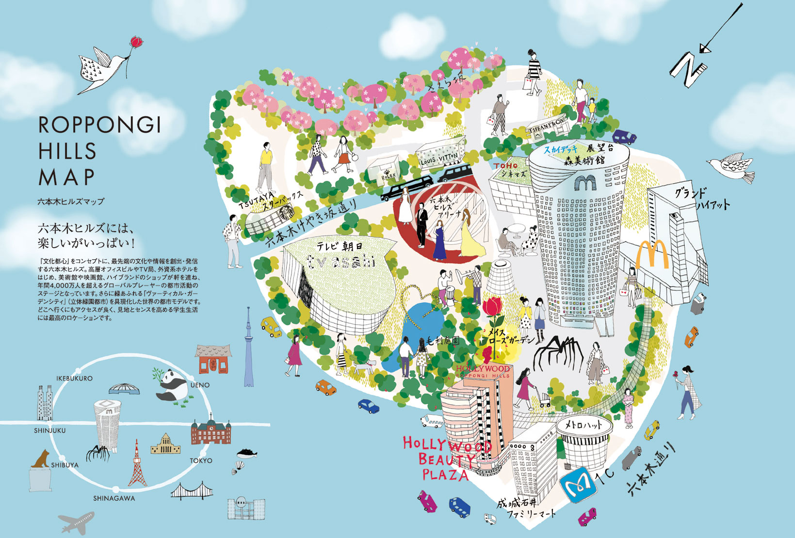 ハリウッドのキャンパスがあるのは、東京都心の中心部『六本木』、ファッショナブルな六本木ヒルズの玄関口です。 美術館や映画館、大企業オフィス、そして世界の一流のお店が集まっています。 一流を感じ、あこがれを抱き、身近にふれることで一流を目指す。 同時に学生にも過ごしやすいカジュアルなお店も多く、地に足のついた学生生活を送ることができます。 六本木ヒルズキャンパスの魅力のひとつはその立地の良さ。日比谷線六本木駅直結で、各線からのアクセスも抜群。オシャレ感度の高い街にもすぐに行くことができます。